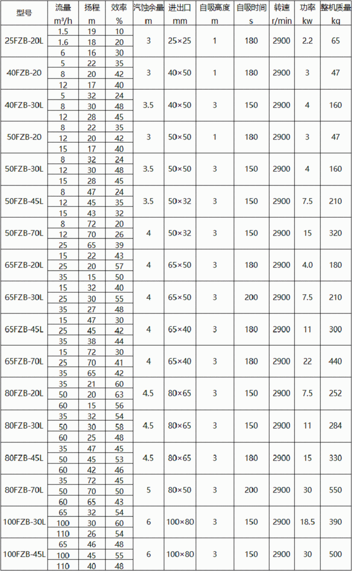 FZB型耐腐蝕自吸泵性能參數(shù)表: