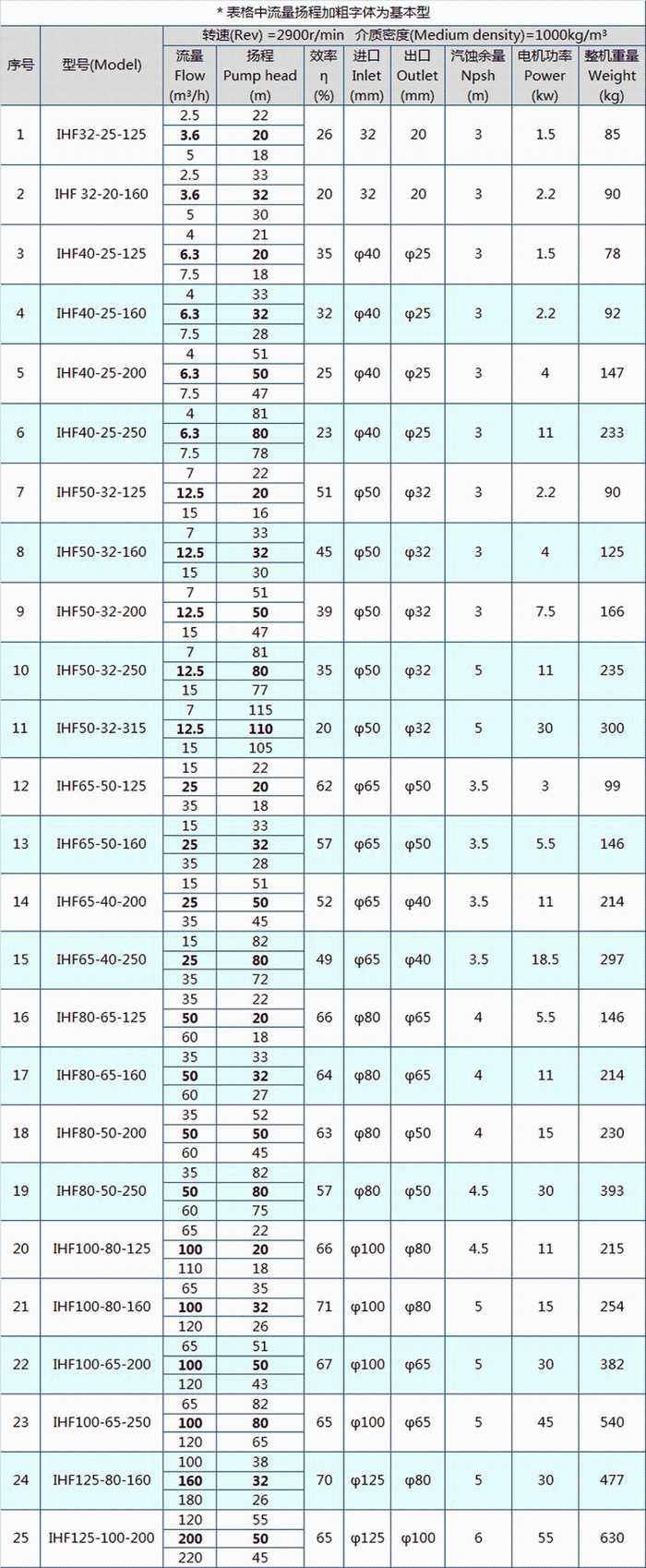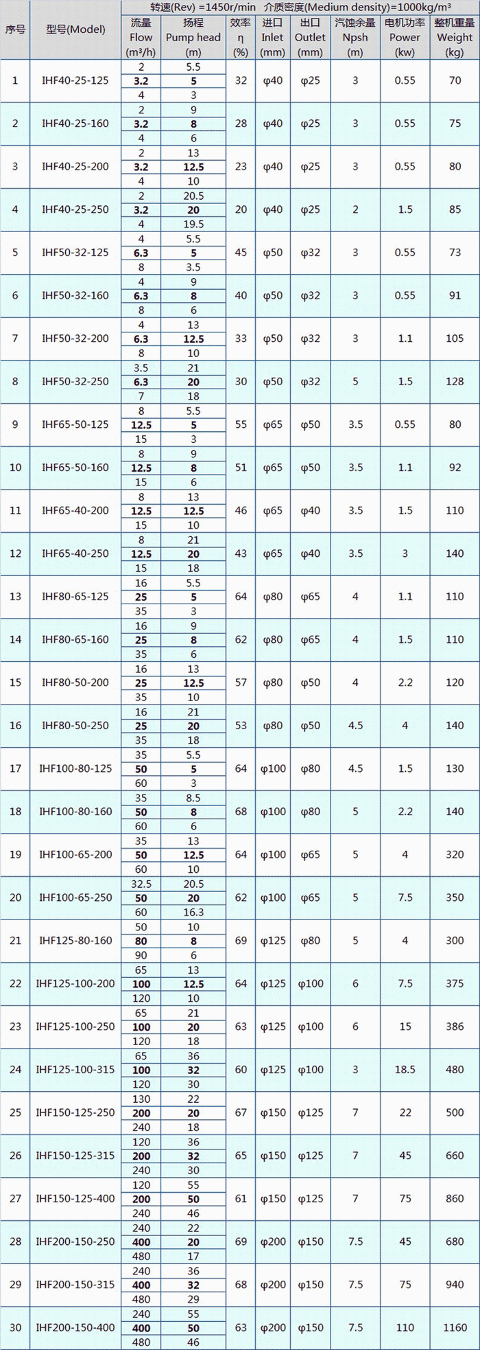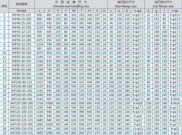 IHF型耐腐蝕化工泵性能參數(shù)表: