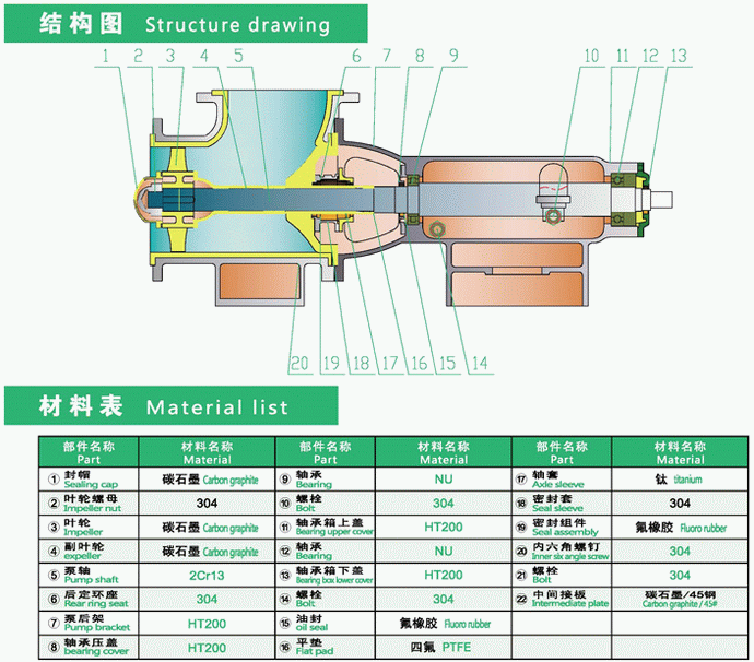 HZWS石墨軸流泵結(jié)構(gòu)圖與材料表: