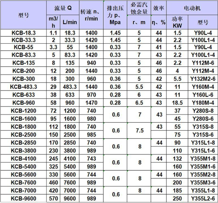 KCB不銹鋼齒輪泵性能參數(shù)表: