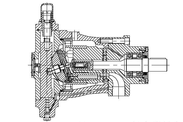 主體部分(參見結(jié)構(gòu)剖)由傳動軸帶動缸體旋轉(zhuǎn),使均勻分布在缸體上的七個柱塞繞傳動軸中心線轉(zhuǎn)動,通過中心彈簧將柱滑組件中的滑靴壓在變量頭(或斜盤)上。這樣,柱塞隨著缸體的旋轉(zhuǎn)而作往復運動,完成吸油和壓油動作。這種泵是依靠內(nèi)控(也可以用外控)油壓操縱變量機構(gòu)。該泵的壓力調(diào)節(jié)范圍比較小,油壓在3~4Mpa時產(chǎn)生變量后,流量迅速減小至所要求的高壓流量值。這種泵實際上相當于高低壓組合泵,泵的驅(qū)動功率選擇可以參照壓力補償變量泵的功率選擇方法進行計算。來自主體部分的高壓油,進入下法蘭下腔(d),當彈簧力大于作用在推桿下端面積上的液壓力時,推動變量活塞向下移動,使泵的流量增加。當作用在推桿下端面積上的液壓力大于彈簧的作用力時,變量活塞向上移動,使泵的流量減少。調(diào)節(jié)變量特性時,根據(jù)所需流量和壓力變化范圍,調(diào)節(jié)調(diào)整套,使泵終級壓力時的流量不再發(fā)生變化,然后調(diào)整調(diào)節(jié)螺桿使泵流量剛發(fā)生變化時初始壓力符合要求。