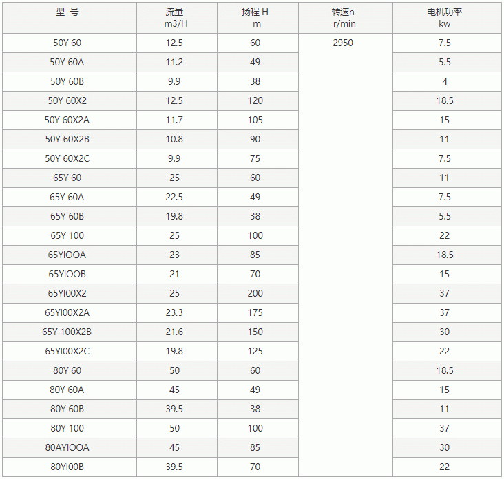 Y、YS型高溫導(dǎo)熱油泵性能參數(shù)表: