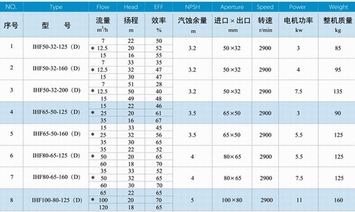 IHF-D型襯氟化工泵性能參數(shù)表: