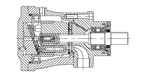 MCY14-1B定量軸向柱塞泵,其原理較為簡(jiǎn)單,泵的傳動(dòng)軸與缸體用花鍵聯(lián)接,帶動(dòng)缸體旋轉(zhuǎn),使均勻分布在缸體上的七個(gè)柱塞繞傳動(dòng)軸中心轉(zhuǎn)動(dòng)。每個(gè)柱塞端部有一個(gè)滑靴,定心彈簧通過(guò)內(nèi)套鋼球、回程盤,將滑靴壓在與軸線成一定傾斜角的斜盤上。當(dāng)缸體旋轉(zhuǎn)時(shí),柱塞同時(shí)作往復(fù)運(yùn)動(dòng),完成吸油和壓油動(dòng)作。定心彈簧通過(guò)外套將缸體壓配油盤上,起初始密封作用?;ズ团溆捅P均采用了油壓靜力平衡,不但減少了泵的磨損,而且使泵具有很高壓的容積效率和機(jī)械效率。