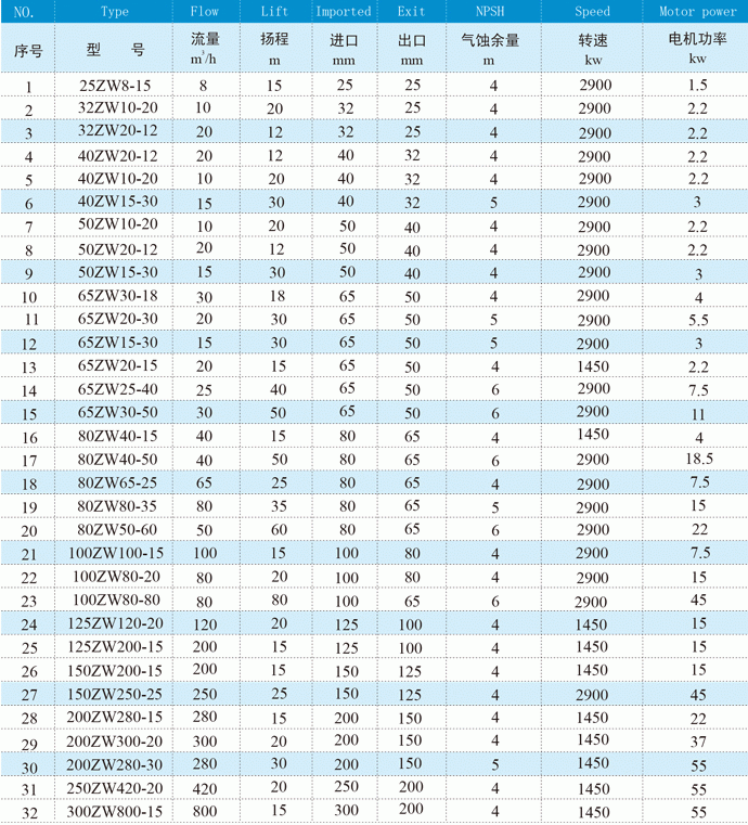 ZW無(wú)堵塞污水泵性能參數(shù)表: