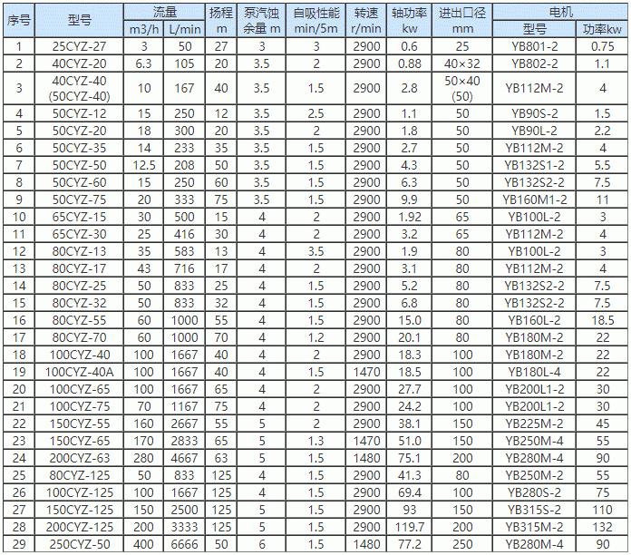 CYZ不銹鋼自吸式離心泵性能參數(shù)表:
