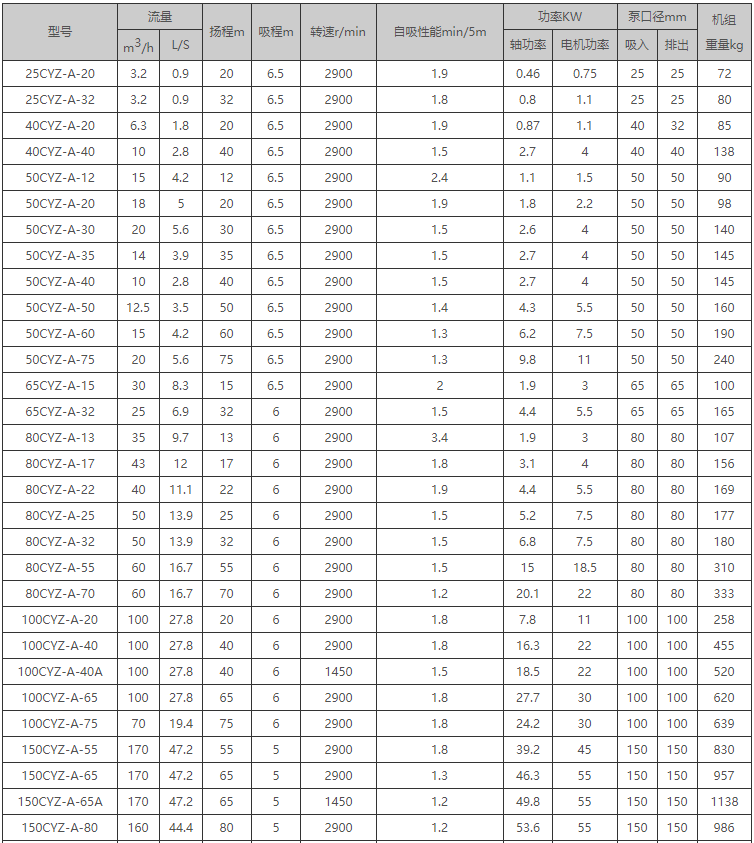 CYZ-A自吸式離心油泵性能參數(shù)表: