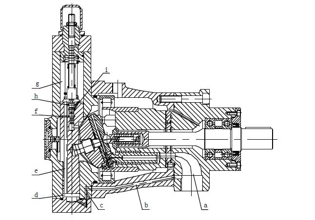 主體部分(參見結(jié)構(gòu)剖)由傳動軸帶動缸體旋轉(zhuǎn),使均勻分布在缸體上的七個柱塞繞傳動軸中心線轉(zhuǎn)動,通過中心彈簧將柱滑組件中的滑靴壓在變量頭(或斜盤)上。這樣,柱塞隨著缸體的旋轉(zhuǎn)而作往復(fù)運動,完成吸油和壓油動作。 壓力補償變量泵的出口流量隨出口壓力的大小近似地在一定范圍內(nèi)按恒功率曲線變化。當(dāng)來自主體部分的高壓油通過通道(a)、(b)、(c)進入變量殼體下腔(d)后,油液經(jīng)通道(e)分別進入通道(f)和(h),當(dāng)彈簧的作用力大于由油道(f)進入伺服活塞下端環(huán)形面積上的液壓推力時,則油液經(jīng)(h)到上腔(g),推動變量活塞向下運動,使泵的流量增加。當(dāng)作用于伺服活塞下端環(huán)形面積上的液壓推力大于彈簧的作用力時,則伺服活塞向上運動,堵塞通道(h),使(g)腔的油通過(i)腔而卸壓,此時,變量活塞上移,變量頭偏角減小,使泵的流量減小。 調(diào)節(jié)流量特性時,可先將限位螺釘擰至上端,根據(jù)所需的流量和壓力變化范圍,調(diào)節(jié)彈簧套,使其流量開始發(fā)生變化時的初始壓力符合要求,然后將限位螺釘擰至終級壓力時的流量不再發(fā)生變化,其中間的流量與壓力變化關(guān)系由泵的本身設(shè)計所決定。