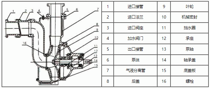 ZW型無(wú)堵塞排污泵,主要由泵體, 葉輪、后蓋、機(jī)械密封、泵軸、軸承座、進(jìn)口閥、氣液分離管、加水閥門(mén)、進(jìn)、排接管等組成。泵的結(jié)構(gòu)見(jiàn)上圖。其工作原理,泵體內(nèi)設(shè)有儲(chǔ)液腔,并通過(guò)上方的回流孔和下方的循環(huán)孔與泵工作腔相通,構(gòu)成泵的軸向加流外混式系統(tǒng)。泵停止工作后,泵內(nèi)腔已儲(chǔ)有一定容積的液體。當(dāng)泵起動(dòng)時(shí),有關(guān)當(dāng)局內(nèi)的儲(chǔ)液在葉輪的作用下,夾帶著空氣被向上拋出,液體通過(guò)氣液分離管的網(wǎng)格回流到工作腔,氣體被排出泵外,使泵內(nèi)形成一定的真空度,達(dá)到自吸的作用。