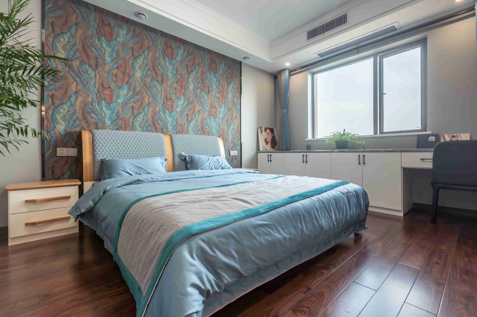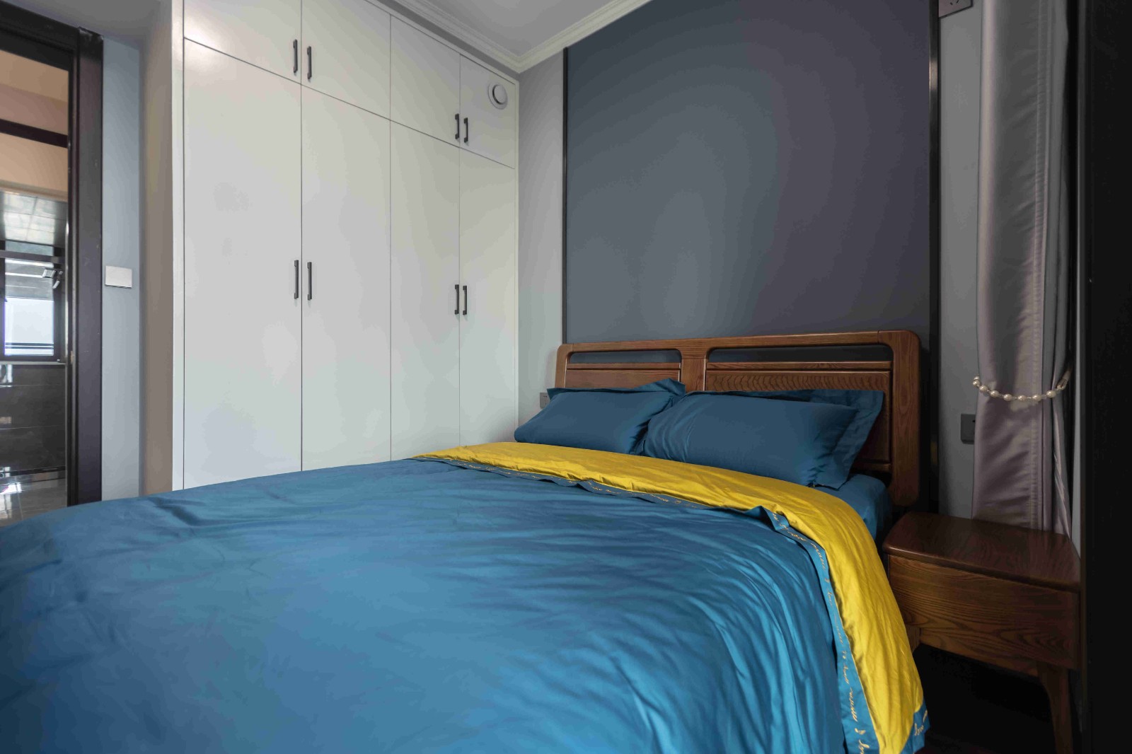 在原戶型的基礎(chǔ)上,并沒有做太多的改動(dòng)??看霸黾恿艘慌哦ㄖ乒褡樱饶茏鍪釆y臺(tái)又能放置東西。最引人注目的是床頭背景墻,充滿了藝術(shù)氣息,深邃幽遠(yuǎn)。