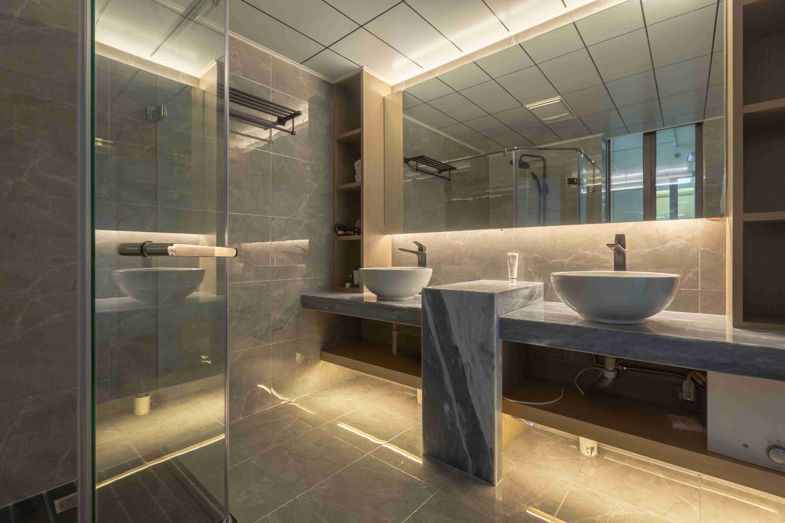 灰色大理石瓷磚和洗手臺(tái),兩個(gè)洗手池,巨大的鏡子,后面藏著隱藏的燈管,簡(jiǎn)潔大氣。
