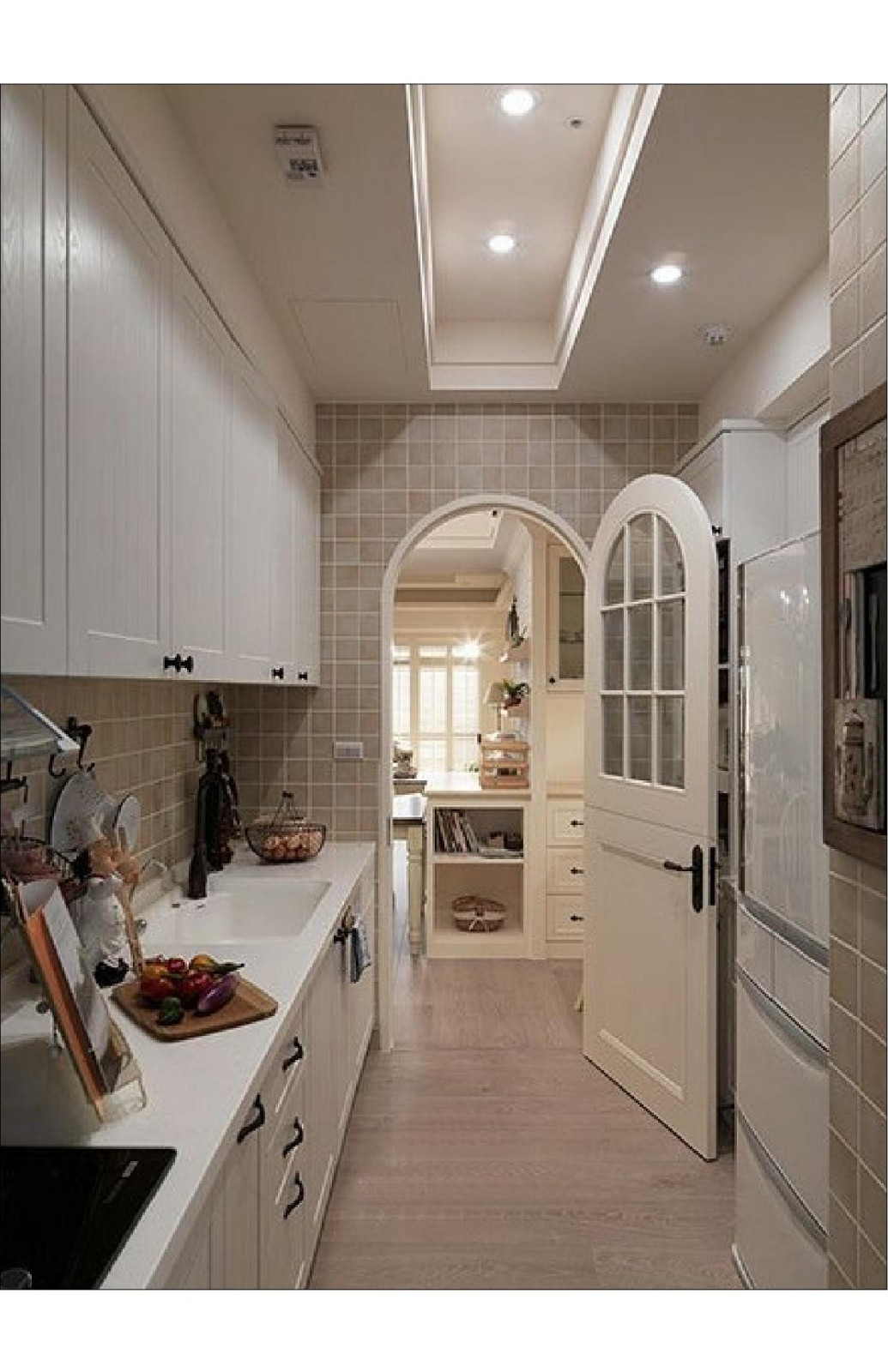 廚房仿木紋地磚的鋪設使廚房地面與外面的地面結(jié)合為一體。墻磚的選擇也是田園氣息濃重。
