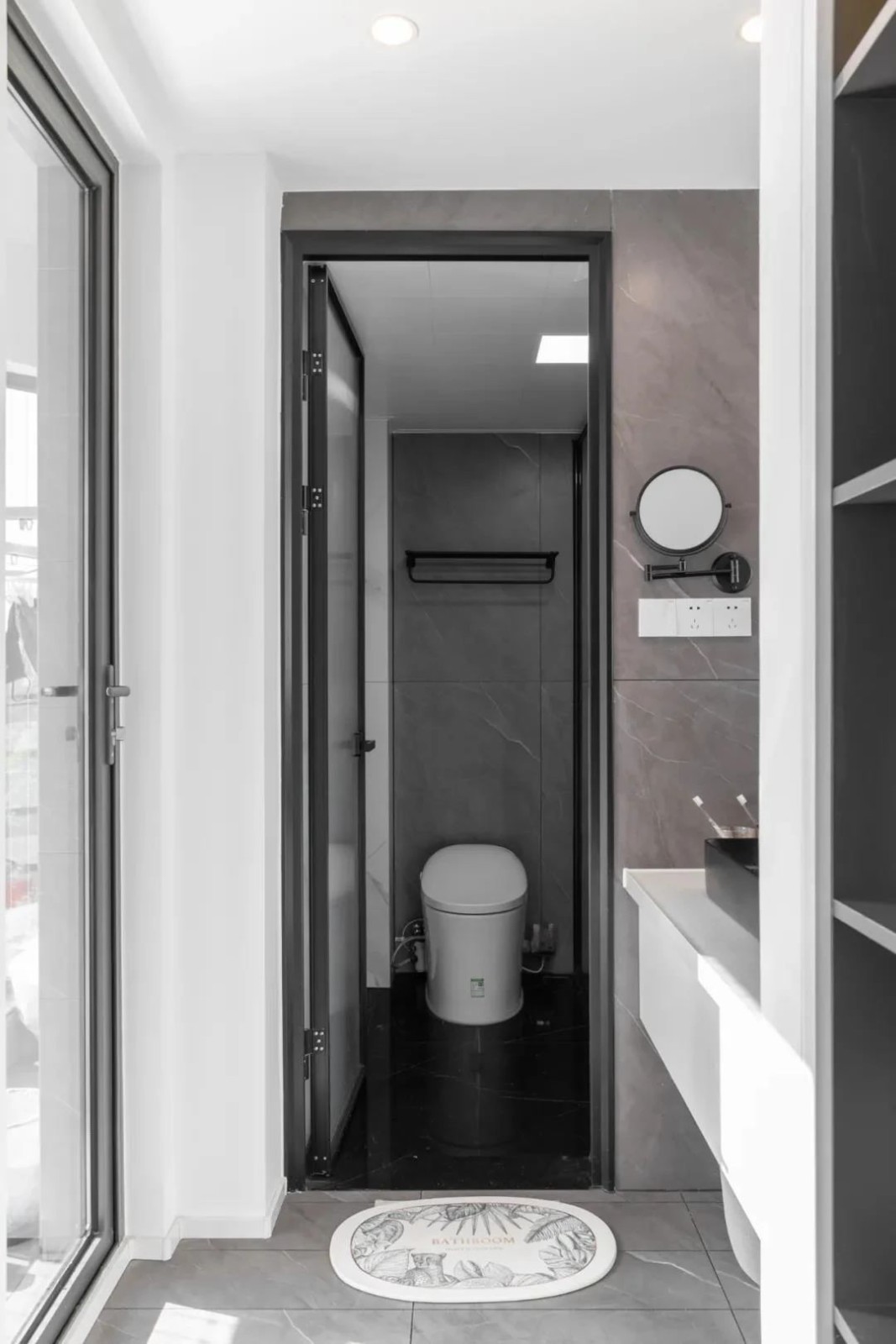 衛(wèi)生間與小陽(yáng)臺(tái)之間用玻璃門(mén)分隔,增加暗衛(wèi)的采光和通透性。