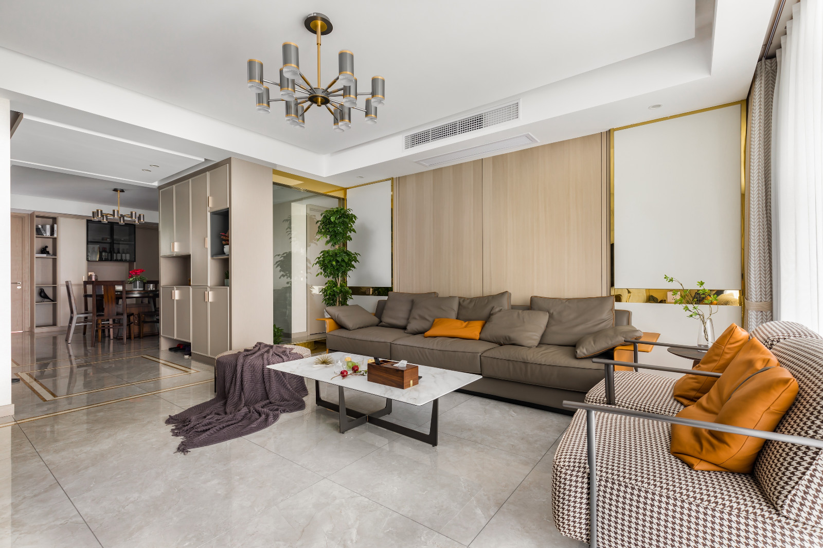 客廳戶型方正,整面木飾面板裝飾沙發(fā)背景墻,原木家具搭配米色布藝沙發(fā),文藝淡雅。