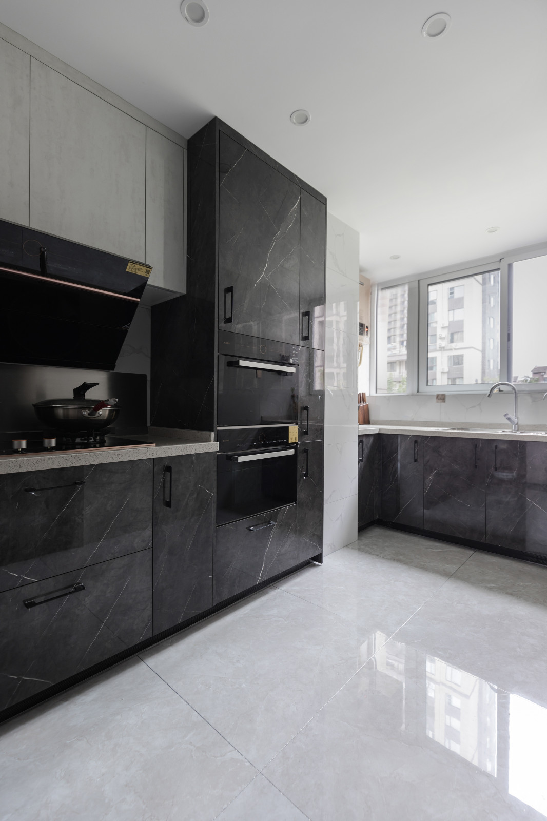 L型開放式廚房設(shè)計(jì),充分利用轉(zhuǎn)角空間,合理布局。白色吊柜柜門+墻磚,搭配木紋櫥柜,色彩清爽簡約。