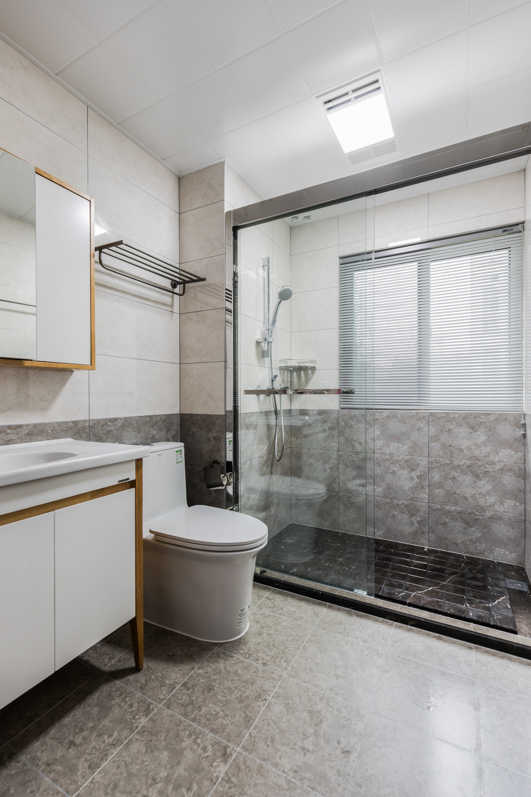 衛(wèi)生間簡約黑白灰掉,白色+灰色墻面腰線設(shè)計(jì),深色簡約臺盆柜加深了空間層次感。